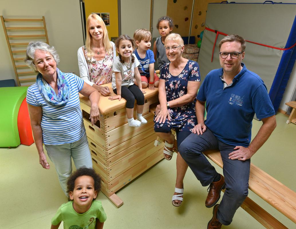Der Förderverein unterstützt regelmäßig die Arbeit unserer Kita und der Jugendfreizeitstätte Offene Tür (OT). Für die Kita gab es jetzt einen Sprungkasten für Sport und Bewegung. Der Kasten, viele kennen das Modell noch aus dem eigenen Sportunterricht, kostete 1200 Euro und wurde vom Förderverein bezahlt. Das Sportgerät kann vielseitig eingesetzt werden, besonders großartig ist es, dass Turnhallenbänke sicher eingehängt werden können. Der Kasten wurde von der Vorsitzenden Christa Hedden und dem Kassierer Siegfried Schwede offiziell übergeben, Kita-Leiterin Sabine Sanders freut sich zusammen mit ihrem Team und allen Kindern auf diese lang ersehnte Ergänzung in der Turnhalle. Auf dem Foto zu sehen von links nach rechts Christa Hedden, Sabine Sanders, Mitarbeiterin Elke Hainke und Siegfried Schwede mit den Kita-Kindern Bryan (unten), Alyssa, Jonas und Mathilda.